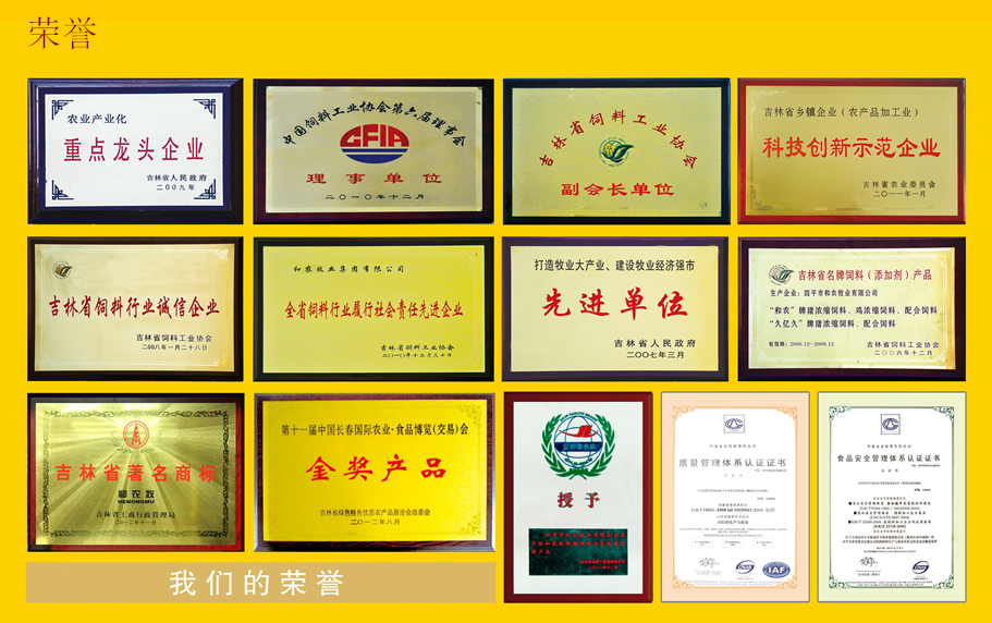 集團(tuán)先后被評(píng)為吉林省農(nóng)業(yè)產(chǎn)業(yè)化重點(diǎn)龍頭企業(yè)、牧業(yè)生產(chǎn)先進(jìn)企業(yè)、吉林省飼料行業(yè)誠(chéng)信企業(yè)、吉林省科技創(chuàng)新示范企業(yè)、吉林省科技創(chuàng)新先進(jìn)企業(yè)、吉林省飼料協(xié)會(huì)會(huì)長(zhǎng)單位、中國(guó)飼料工業(yè)協(xié)會(huì)理事單位,“和農(nóng)”品牌榮獲“吉林省名牌飼料產(chǎn)品”與“吉林名牌”稱號(hào)、吉林省著名商標(biāo)。創(chuàng)業(yè)先后通過了“ISO9001:2008質(zhì)量管理認(rèn)證”和“HACCP食品安全認(rèn)證和農(nóng)乳豬奶料、保育豬配合飼料、蛋王飼料連年榮獲中國(guó)農(nóng)業(yè)食品博覽會(huì)金獎(jiǎng)。