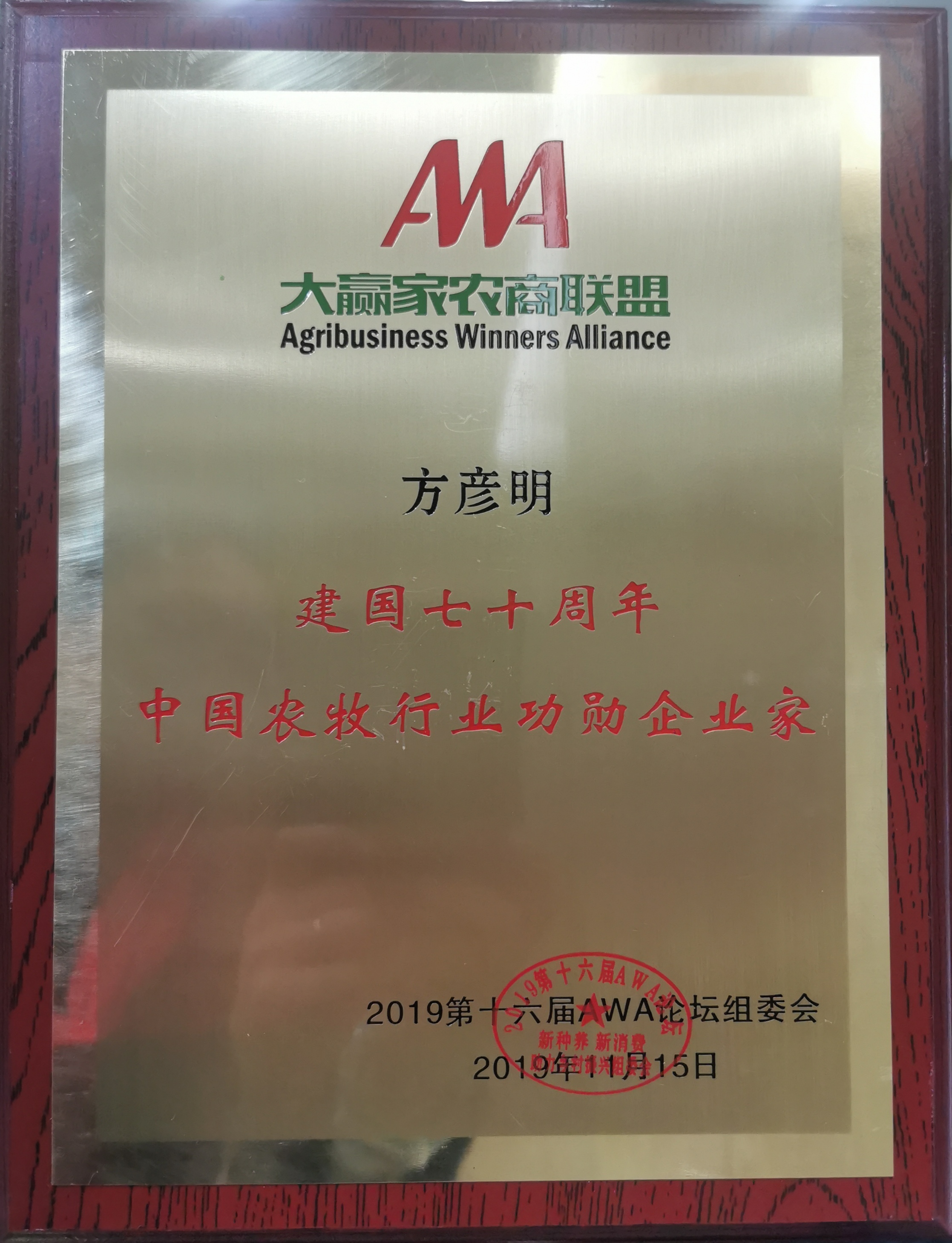 11月14-16日,由鄉(xiāng)村振興實(shí)施路徑研究國(guó)家重大課題組和AWA大贏家農(nóng)商聯(lián)盟主辦的2019第十六屆大贏家(AWA)論壇在北京市中國(guó)人民大學(xué)逸夫會(huì)議中心隆重召開(kāi),吉林和農(nóng)牧業(yè)集團(tuán)董事長(zhǎng)方彥明先生榮獲建國(guó)70周年中國(guó)農(nóng)牧行業(yè)功勛企業(yè)家。